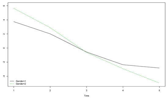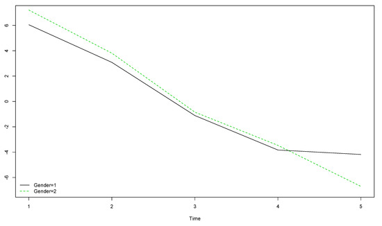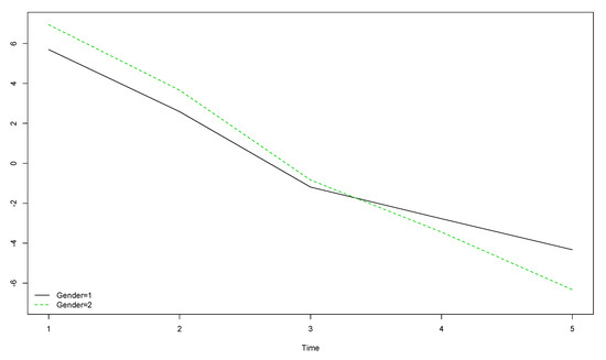 The comparison of boys’ and girls’ PWI scores showed that girls’ (gender = 2) scores were higher than boys’ (gender = 1) at the start of the longitudinal study but lower at the end, meaning this decrease was more pronounced for girls (Figure 7).