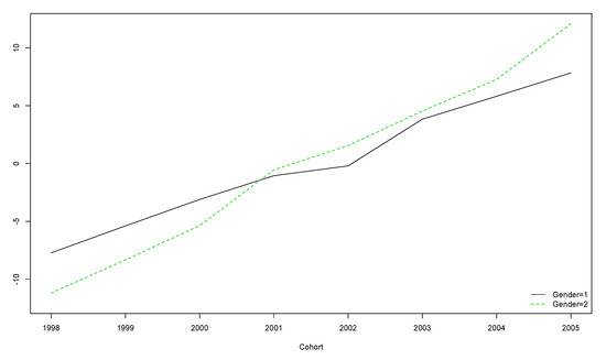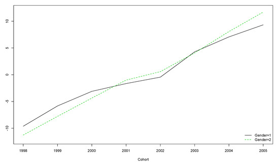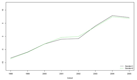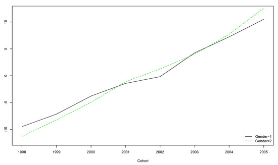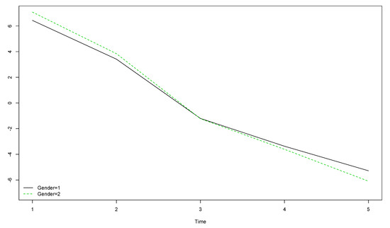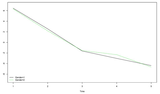 Girls’ (gender = 2) BMSLSS scores were higher than boys’ (gender = 1) at the start of the longitudinal study, but lower at the end. This decrease was more pronounced for girls. For boys, the trend in BMSLSS scores stabilizes between the fourth and fifth years of data collection (Figure 9).