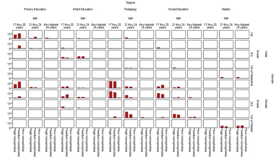 In this sense, higher indices of socialisation correspond to the aforementioned age range, and mobile phone use constitutes one of the most socialising aspects of young populations [,,]. As a result of this, a link between smartphone dependence and relationships with other individuals is generated. With regards to degree title, some authors indicated that the degrees of Social and Infant Education are highly vocational [,,]. This implies a high capacity of attention towards these types of higher studies relative to the degrees of Primary Education and Pedagogy, which are not so specific or vocational. In a certain way, this enables students to prioritise other elements and could justify the results obtained in the present study.