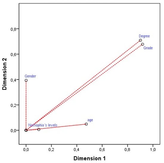 As can be observed, we firstly highlighted that the variable pertaining to gender, in obtaining a parallel position to dimension two (x = 0; y = 0.410), becomes a good discriminating element of that dimension. This can also be said for the variables pertaining to the nomophobia level (x = 0.005; y = 0.101) and age (x = 0.475; = 0.055) with regards to dimension one. For their part, the variables pertaining to degree title (x = 0.902; y = 0.710) and degree year (x = 0.918; y = 0.666) achieved a bisector profile with regards to the equidistant origin, both for dimension one and dimension two. This converts them into discriminating variables of these two dimensions, and, further, as they are found further away from the origin, they possess greater explanatory power. Finally, we present the bio-spatial correspondence chart for the different levels of the contemplated variables, as shown in Figure 3.