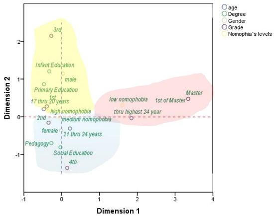 Following the observations of the immediately preceding figure (Burt table), different correspondence paths immediately seem to be drawn at a merely descriptive level. In this way, we can appreciate how high levels of nomophobia appear to be more strongly associated with the female gender, those aged between 17 and 20 years, with the degree titles of Primary Education and Pedagogy and undertaking the first years of a degree (first and second). In contrast, the moderate and low levels of nomophobia appear to be related with other ages; that is to say, from 21 to 24 years and older than 24 years. In addition, they are linked to the degree titles of Infant Education and Social Education and to a Master’s degree and undertaking the final years of a degree course (third and fourth and first Master’s).