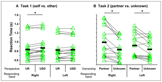 - Ruby, P.; Decety, J. Effect of subjective perspective taking during simulation of action: A PET investigation of agency. Nat. Neurosci. 2001, 4, 546–550. [Google Scholar] [CrossRef] [PubMed]