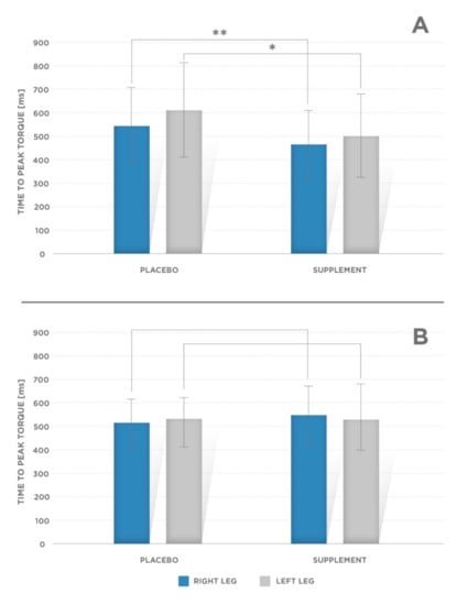 - Time to peak torque—TTP [ms] (Figure 2A, Table 1) for the knee flexors (p = 0.002 for the right and left leg);