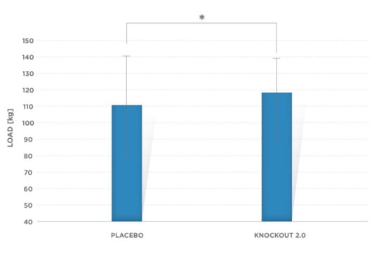 Mean 3-RM strength for placebo treatment was 110.6 ± 29.75 kg, while for the supplement, subjects’ performance was 118.82 ± 29.89 kg, which demonstrated a statistically significant difference (p = 0.001; Figure 4).
