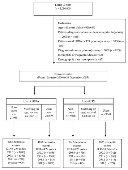 - Tai, S.-Y.; Chien, C.-Y.; Wu, D.-C.; Lin, K.-D.; Ho, B.-L.; Chang, Y.-H.; Chang, Y.-P. Risk of dementia from proton pump inhibitor use in Asian population: A nationwide cohort study in Taiwan. PLoS ONE 2017, 12, e0171006. [Google Scholar] [CrossRef] [PubMed]