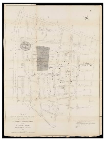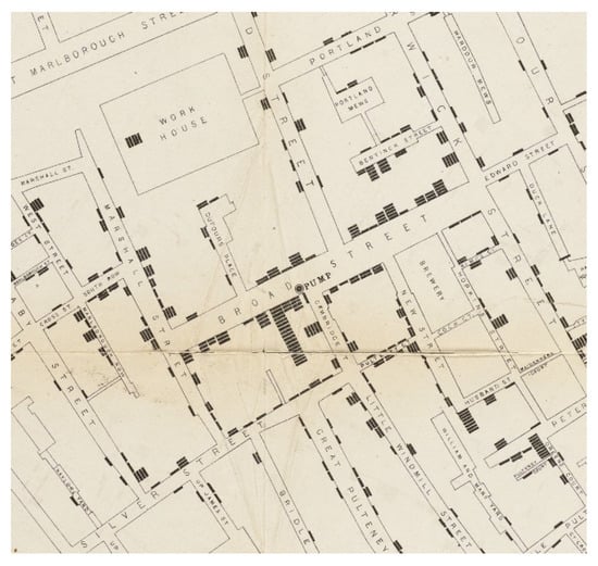 Although previously it was thought that the cause of this outbreak was miasma—also known as airborne particles [11,12], and as depicted in Figure 1 and Figure 2 [13,14] created by Snow, he was able to identify the source of cholera as a waterborne disease instead. Given this location and accessibility of the water pump (Figure 2), citizens in this locality who were living or visiting the area for work would drink from the pump, which in turn facilitated the disease to travel, resulting in an increase in deaths. However, some of the workmen in the area chose not to drink from the water pump but instead chose to drink alcohol from the local brewery (including men who worked at the breweries); this choice led to the bacteria found in the waterborne disease to be killed [15]. The workhouses in the area also had their own water supply, and this too resulted in fewer deaths from cholera [15,16].