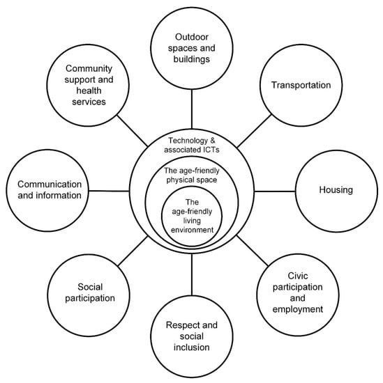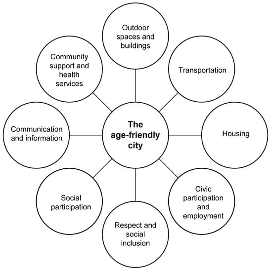 The scholarly activity by Meijer and Bolivar [98] focused on the concept of smart urban governance and concluded this notion was between the collaboration of citizens and technology. The Centre for Ageing Better [99] based in the UK highlights the number of towns and cities that have received age-friendly status (n = 40) via support and engagement from stakeholder organizations, residents, and the leadership of respective towns and cities. Taking the lead from the eight domains (Figure 3) published by the WHO age-friendly framework [36], 1. Outdoor spaces and buildings, 2. Transportation, 3. Housing, 4. Social participation, 5. Respect and social inclusion, 6. Civic participation and employment, 7. Communication and information, and 8. Community and health services (Figure 3), the Centre for Ageing Better state, “Together, the eight domains and programme cycle create the framework for how places become increasingly age-friendly” [36].