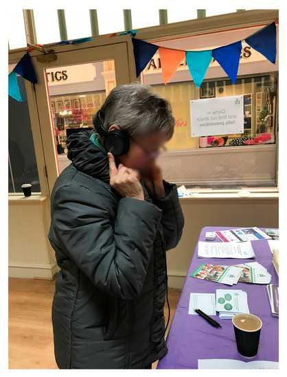 Over a duration of four hours, members of the organisation used the iPad to play the pre-recorded statements by older and younger people to passers-by (see Figure 2). A.R.’s field notes recorded that “many members of the organisation joined the team on the day, eager to promote their organisation’s work”. The setup of the iPad with the headphones caught many people’s interest as they were passing by. The organisation’s members actively approached and prompted people in the market to join them and listen to the recordings. Indeed, over the course of the morning, around 15 people listened and engaged with the group as a response. However, despite this heightened level of interest, only four people were willing to record their own responses. These responses were on average 1.26 min long and, despite our prompts to share opinions on intergenerational cohesion or raise local issues, the responses included a variety of topics: Food banks and social inequalities within the city; personal health issues; an interest in the history of the city; and a general political critique. Indeed, many of the people who chose not to be recorded were triggered by the intergenerational provocations to voice their concerns about or agreement with national issues. The experience showed that despite prompting for a certain topic, using audio sparked highly emotive discussions on a variety of topics and, in particular, on the wider political landscape. As an evaluation, the organisation and researchers jointly agreed that the approach of using audio as a way to collect evidence on a specific topic in a public space had its limitations. These were mainly due to people’s concerns or shyness about being recorded and the wide variety of unanticipated topics raised by members of the public. We concluded that the pre-recorded statements needed to be refined and less provocative, in order to generate responses on topics that are relevant to the organisation and that can be used specifically for advocating for age-friendly work within the city. However, the intervention was not followed up directly, as the organisation decided to pursue a different strategy for their market unit in the following months.