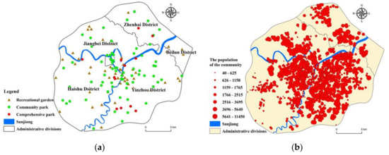 Park type (a) and residential community population distribution (b) in Ningbo.
