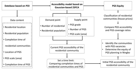 The framework proposed in this study is schematized in Figure 4. Accessibility levels are quantified by a Gaussian-based 2SFCA model based on supply and demand. Please refer to Section 2.2 for a detailed description of the model. By setting the service radius of different PGSs, we accurately derive the supply level of PGSs in Ningbo. Combining the location and population of the residential communities, we calculate the level of PGS accessibility at the current stage. Based on this, we modified the method by setting a time limit to calculate PGS’s accessibility at the beginning of each residential community’s construction. To further explore PGS planning equity in Ningbo, we use housing prices to reflect residents’ socio-economic attributes. The study aims to provide a new perspective to evaluate the distribution of urban PGS that is easy to imitate and practice. We hope to provide new insights for evaluating spatial equity in urban public facilities and guidance for urban planning departments.