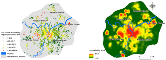Half of the world’s population lives in cities, and the urban population’s rapid growth places higher demands on infrastructure [1]. The distribution and quality of urban green space highly affect urban residents’ physical and mental health [2,3,4]. However, due to the rapid urban expansion and population growth, planners face a significant challenge in preserving urban green spaces, especially parks in developing countries [5]. Although there are precise legal requirements for green space and public green space per capita, government measures have resulted in a mismatch between green space supply and demand, resulting in social inequity and low service satisfaction in the city [6,7]. Therefore, it is necessary to clarify the spatial differences in green space accessibility in urban planning [8,9]. This research will focus on publicly accessible park green space (PGS), which will benefit urban residents’ health and recreation.