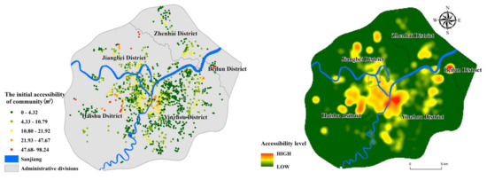 Figure 5a shows an example of the first step, where we set d0 according to the PGS type, and there are six residential communities in the spatial scope of the PGS. For each of them, the spatial distance from the PGS can be measured, and then the corresponding Gaussian equation can be established according to Equation (2), respectively. The PGS area and the number of people represented by each community are also known, so the corresponding supply and demand ratios can be derived from Equation (1). In Figure 5b, we set the spatial extent with the residential community as the center, and d0 is set to 2500 m depending on the residents’ travel speed. According to Equation (3), the PGS accessibility of the residential community is obtained by accumulating the supply ratio to demand for each community.