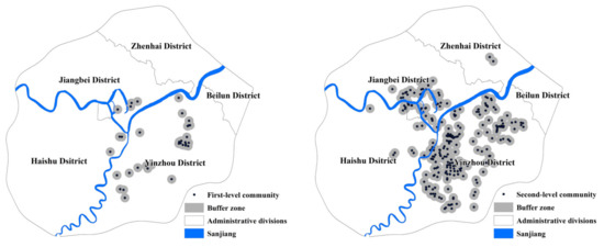 In Equation (4), Cr is the coverage ratio of park green space. Ni is the number of i-level communities within 500 m of the park green space. Siis the total number of -level residential communities.