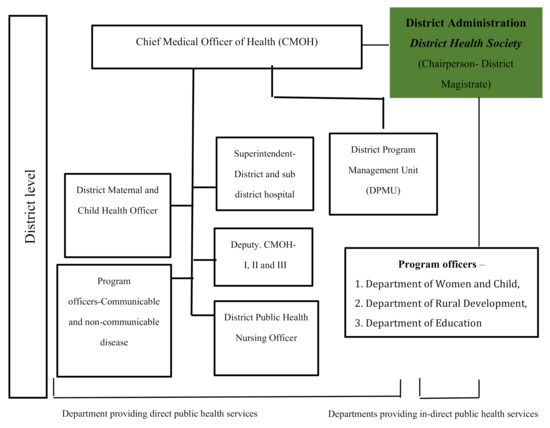 The CMOH also supervises the functioning of the National Health Mission’s District Programme Management Unit, which assists in preparing plans, an annual budget and in maintaining accounts. CMOHs are supported by three deputy chief medical officers whom each have responsibility for specific areas, such as health administration and tendering; communicable and non-communicable diseases, reproductive and child health services, and the HMIS [26].