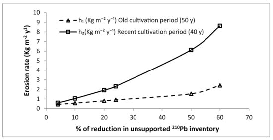 If during the two cultivation periods, only erosion happened on the location, 210Pbex is sufficient as radiotracer to determine the value of erosion rate during each period using Equation (4). Figure 1 illustrates the result of a numerical test of the model (Equation (4)). The figure shows the obtained relationships between soil erosion rate and the percentage reduction in 210Pbex inventory relative to the local reference inventory for a hypothetical eroding soil. The old and the recent period of cultivation are assumed equal to 50 and 40 years, respectively ( y and y). The following values of the employed relevant parameters were considered: kg m−2(plow depth of the old period), kg m−2 (plow depth of the recent period), and Bq m−2.