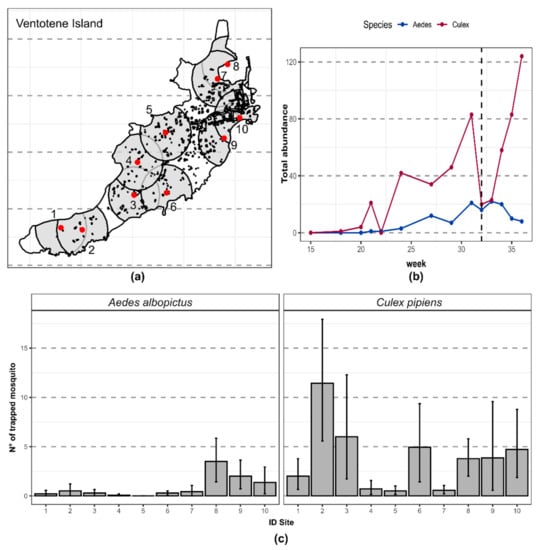 (a) Ventotene Island. The red dots are the BG-traps; the number uniquely identifies them along the natural to urban gradient, quantified by the percentage of area covered by buildings (black dots) in a 250 m radius buffer around each trap (grey area). (b) The total number of mosquitoes collected per species (Aedes albopictus, Culex pipiens). On the x-axis, the week of collection is included, while the y-axis presents the total number of mosquitoes captured. The dots represent the week of sampling. The vertical dashed line represents a pest control intervention using insecticide spraying on the island. (c) Average number of mosquitoes captured per trap. The x-axis presents the site identification number; see panel (a). The y-axis shows the number of mosquitoes captured. Bars represent the average number, and vertical lines represent a 95% confidence interval of the mean.