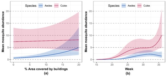 Results of the generalized additive model: (a) Relationship between the percentage of area covered by buildings (natural to urban gradient) and the mosquito abundance. The x-axis represents the percentage of area covered by buildings, and the y-axis represents the mosquito abundance. The solid line represents the average mosquito abundance, and the shaded areas are the 95% confidence intervals; (b) seasonal dynamics of mosquito abundance as estimated by the smoothers in the generalized additive model. The x-axis represents the week of the year, and the y-axis represents the mosquito abundance. The solid line represents the average mosquito abundance, and the shaded areas are the 95% confidence intervals. The average was computed assuming a 10% area covered by buildings.