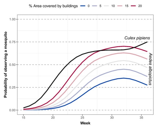 Detection probability of mosquitoes in the 0–1 range. The x-axis shows the week, and the y-axis shows the probability of observing at least one mosquito. The black solid line represents the detection probability of Culex pipiens, which is not statistically associated with the percentage of area covered by buildings. The colored solid lines represent the detection probability of Aedes albopictus conditional on the percentage of area covered by buildings.