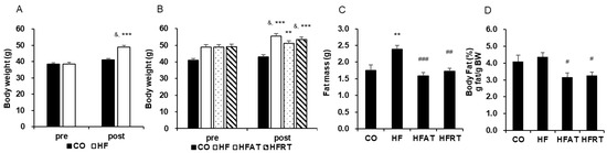 Changes in body weight and body fat after obesity induction and exercise intervention. Changes in body weight after 8 weeks of high-fat diet (HFD) (A) and 8 weeks of exercise (B) are presented. Changes in fat mass (C) and % body fat (D) after 8 weeks of exercise are also presented. Data are expressed as the mean ± standard error. CO, normal diet group; HF, HFD group; HFAT, HFD + aerobic training group; HFRT, HFD + resistance training group; BW, body weight; & p < 0.001, versus before; *** p < 0.001, versus the CO group; ** p < 0.01, versus the CO group; # versus HF group, p < 0.05; ## versus HF group, p < 0.01; ### versus HF group, p < 0.001.