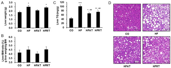 Changes in the liver weight, liver triglycerides (TG), and hepatic lipid droplet after exercise intervention. Changes in the liver weight (A), liver/BW ratio (B), liver TG levels (C), and hepatic lipid droplet (D) after exercise intervention are presented. Data are expressed as the mean ± standard error. CO, normal diet group; HF, high-fat diet (HFD) group; HFAT, HFD + aerobic training group; HFRT, HFD + resistance training group; BW, body weight; * p < 0.05, versus the CO group; ** p < 0.01, versus the CO group; *** p < 0.001, versus the CO group; ## p < 0.01, versus the HF group. Scale bar = 20 µm.