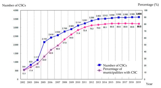 In 2002, the Japanese government began building comprehensive community sports clubs (CSC) in all communities to create a lifelong active society and sport-friendly environment for all citizens. The main goals of the CSC project include providing convenient and affordable sports complexes for all residents in a community and creating a sports environment accessible to residents of all ages, genders, and ability levels, thus facilitating social activities. The number of CSCs has achieved great growth year-on-year a decade after the policy was implemented. The number and established percentage of CSCs in 2002, 2013, and 2019 were 541 (13.1%), 3493 (79.0%), and 3604 (80.5%), respectively (Figure 1) [41]. In terms of age, members under 12 years old constitute the largest group (19.6%); older participants include those aged 70+ years (10.9%) and adults aged 60–69 (9.5%). The number of 60+ participants will continue to rise as the population ages. Older people tend to participate in CSCs rather than other community centers and fitness clubs due to affordable prices and multiple benefits. The Japanese government advocates that CSCs should strive to provide more opportunities for people to engage in sports activities and create an intergenerational platform to bring the young and old together [42]. Previous research has highlighted the importance of intergenerational communication for older people; this relationship was considered a crucial factor for their age-related coping and social integration [43]. Furthermore, such communication improves psychological well-being and life satisfaction among older people, especially for people aged 74–85, who have significantly greater satisfaction in positive self-perception and anticipation [44]. Despite the prevalence of 60+ participants in Japan, this group, silver citizens, is not yet the primary service target, but an increasing population for CSCs [42]. Older people have access to fewer sports services than other groups in the CSCs, and it seems that they invest more than they receive. To investigate older people’s evaluation of CSC sports services, this study measured their feedback on sports service quality. Specific suggestions are provided for improving the quality of the sports environment for actively aging older people.