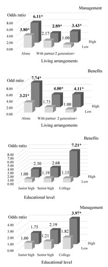 Stratified analyses showed the significantly highest HA scores among elderly participants over 65 years with the highest SQS scores, regardless of sociodemographic information or club participation behavior (n = 365). For the SQS-benefits domain, the highest HA scores were found in participants living alone who fell into the higher SQS-benefits score (score ≥ 12.55). A less obvious relationship between HA scores and SQS-benefits was observed among participants living with 2+ generations. The highest HA scores were observed among participants with higher SQS-benefits scores, regardless of their education status and number of CSC memberships (Figure 2). The model of SQS-management domains (score ≥ 12.76) and the significant factors related to the HA group also showed similar results.