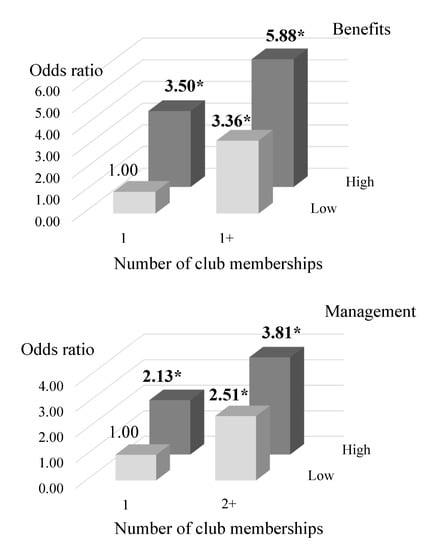 One primary goal in this study was to explore the strength of association between service quality for sports and confounding healthy active aging attitude factors. Our findings have revealed a high strength of association among demographic factors such as living alone, having graduated from college, and having more than one club membership and both management and benefit SQS domains on healthy active aging. Interestingly, our findings showed that individuals living alone who more highly evaluate the benefit of sports have a 7.74 times greater likelihood of healthy active aging than elderly participants living with 2+ generations with a lower evaluation (Figure 2). Elderly participants living alone participated at CSCs to combat the negative impacts of living alone, including isolation, loneliness, and depression [71]. They seek social connection through CSCs, with a “use it or lose it” attitude toward aging [80]. Older people were inclined to participate in sports organizations where they can build connections. Previous research has demonstrated that participating at CSCs fosters social connections and increases social network size, particularly for older people [81]. Importantly, social network size and number of social contacts were revealed as determinants of life satisfaction and successful aging among older people [43,82]. A systematic review study has highlighted that community-based sports clubs benefit older participants in negotiating a negative aging process, fostering social connections, and decreasing social loneliness, especially in rural areas [19]. The findings demonstrated that even the elderly living alone can still fight stereotypes of aging, like weakness, through sports participation. The desire to compete and perform is the motivation for active agers to participate at CSCs; therefore, the value of a well-managed CSC with good facilities and a safe sports environment to encourage active aging and self-efficacy for senior customers must not be underestimated [71].