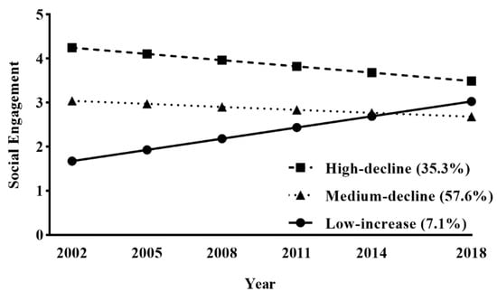 Social engagement (SE) is defined as an individual’s social behavior and social structure and is a significant component of active aging, a central topic in many aging studies []. When assessing the SE of the older population, much research has focused on SE’s inactive status. Several recent studies have provided some insights into the changing patterns of SE based on the dynamic perspective of aging [,]. These studies have examined the relationship between SE and personal characteristics based on the assumption that the older population is homogeneous. Concrete evidence across different countries indicates that sociodemographic characteristics, such as sex, age, education, residence status, occupation, and pensions, play essential roles in the SE among older adults [,,], and that their SE levels are related to disability, cognitive impairment, loneliness, and general well-being [,,].