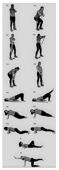 The progressive strength training program consisted of group-based training, especially focused on increasing core muscle strength (Figure 1) (Table 1). To avoid decreased personalized care in group-based interventions, the initial intensity and further progressions were individualized for each subject. To ensure adequate activity for the respective muscles, exercise selection was based on previous studies [25].