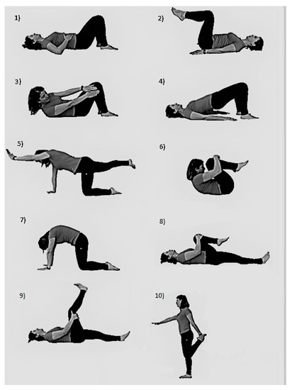 Back-School program exercises. (1) Abdominal hollowing; (2) Knee-up; (3) Oblique crunch; (4) Supine plank; (5) Bird-dog; (6) Knees-to-chest stretching; (7) Cat-camel; (8) Lying psoas stretching; (9) Lying hamstring stretching; (10) Standing quadriceps stretching.