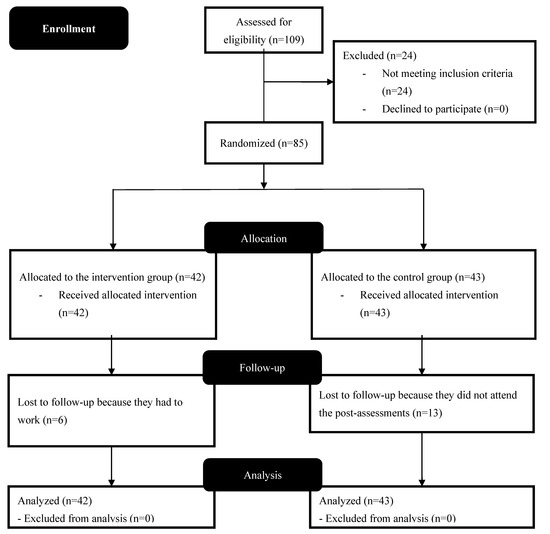 Demographic data was as follows: the control group (n = 43) had a mean age of 50 ± 12 years, a height of 165 ± 7 cm, and a weight of 72 ± 14 kg. The intervention group (n = 42) had a mean age of 52 ± 11 years, a height of 164 ± 10 cm, and a weight of 76 ± 19 kg. Figure 3 shows the complete flow chart diagram of the progress through the phases of the study.