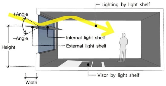 As shown in Figure 1, a light shelf is a natural lighting system installed on a window that introduces natural light from the outside by reflecting the light shelf reflector and the ceiling surface of the indoor space, reducing energy used for lighting [29]. A light shelf can also create a comfortable visual environment by addressing the unbalanced distribution of illumination in indoor space by blocking excess natural light coming through a window. Light shelf variables that determine its performance include width, angle, height, and reflectivity. The light shelf may be an internal or external type depending on the installation location [30].
