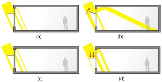 As shown in Table 1, there have been diverse studies on improving lighting performance and the indoor visual environment. As shown in Figure 2, many studies varied the light shelf’s height and angle to improve lighting performance [16,18,20,21,22,23,24,25,26,27]. However, changing reflectivity was difficult because it required changing the light shelf’s angle or height. Therefore, previous studies evaluated shelf performance with fixed reflectivity. Some studies [16,21,25] considered a light shelf’s specific reflectivity when designing and applying it. If light shelf reflectivity is high, the lighting performance improves because more light enters the room through reflection. However, in some cases, this can cause excessive glare for occupants [31]. Meanwhile, if a light shelf’s reflectivity is low, the amount of natural light entering through the light shelf decreases, and the lighting performance deteriorates. In this case, the glare issue can be improved. Therefore, a light shelf’s reflectivity is an important variable that can reduce lighting energy in an indoor space and improve its visual environment. Therefore, the development of a light shelf capable of changing its reflectivity is considered in the current analysis, which differentiates this research from prior studies.