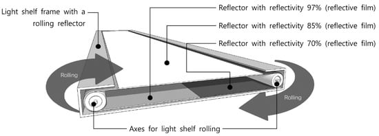 First, as shown in Figure 3, the proposed light shelf has connected reflective films with 70%, 85%, and 97% reflectivity, respectively. The film can be rolled by two axes to change reflectivity. The reflectivity values of 70% and 85% were chosen based on prior studies [13,14,18,22,23,24], and the reflectivity value of 97% was the reflective film manufacturer’s specification [39]. This is the result of an adjustment because lighting performance increases with reflectivity.