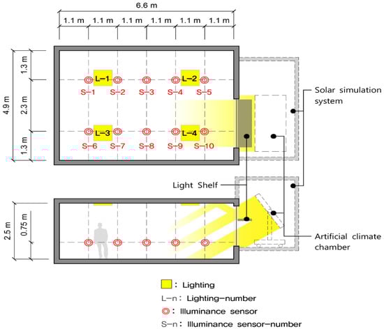 First, the dimensions of the testbed constructed for the performance evaluation is 4.9 m (W) × 6.6 m (D) × 2.5 m (H), and the reflectivity of the indoor space is set to 86% for the ceiling, 46% for the wall and 25% for the floor. The skylight on which the light shelf is installed is 1.9 m (W) × 1.7 m (H) with pair glass applied, and the window transmissivity is 80%.