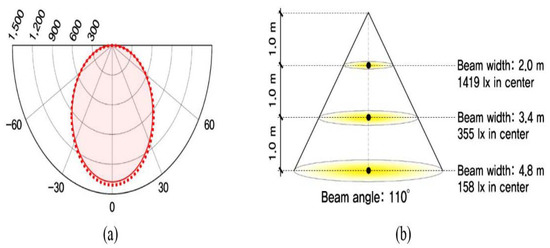 Light distribution curve and conical illuminance of lighting: (a) conical illuminance; (b) light distribution.