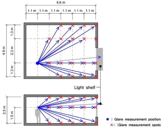 Fourth, as shown in Figure 7, luminance values for 39 points were measured by considering the human viewing angle. The luminance of the light shelf reflector was also measured in order to obtain an average value by measuring eight points on the light shelf reflector. However, luminance could not be measured because measurement positions were not accessible when the light shelf angle was 0° and −10°, so luminance was measured on the window’s glass surface at the top of the light shelf. The luminance measurement location was set at 1.5 m from the floor and 5.5 m away from the skylight to consider the indoor space’s depth. The glare was analyzed based on the measured luminance and contrast values. The luminance measurement equipment is a handy type of high-precision luminance meter, the detailed specifications of which are shown in Table 6.