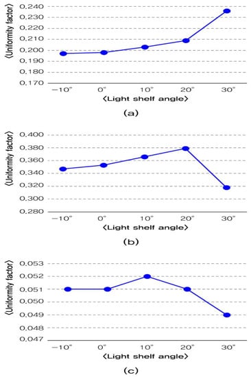 Analysis of uniformity per light shelf angle: (a) uniformity per light shelf angle in summer; (b) uniformity per light shelf angle in middle season; (c) uniformity per light shelf angle in winter.