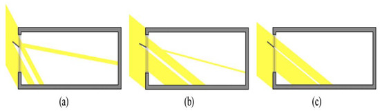 Diagram of light flow into a room per light shelf angle: (a) light shelf angle 30° in summer; (b) light shelf angle 20° in middle season; (c) light shelf angle 30° in winter.