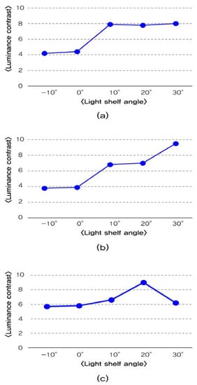 Third, results of the luminance contrast depending on the light shelf angle, are reported in Table 7 and Figure 10. The light shelf’s angle control with a reflectivity of 85% had a luminance contrast value below 10, so glare was not generated in this condition. However, when the light shelf’s reflective surface angle was more than 10°, which is a light shelf angle that makes luminance measurement points exposed for measurement, its luminance contrast value was higher compared to the scenario in which the light shelf angle was –10° or 0°. Thus, it is advantageous not to expose the light shelf reflector to occupants by fixing the light shelf’s angle to 0° or less to decrease the luminance contrast value. Also, when the light shelf angle was 30° for the middle season and 20° for the winter, the external natural light could be exposed directly to the occupant through light shelf reflection. The luminance contrast value can also be high.
