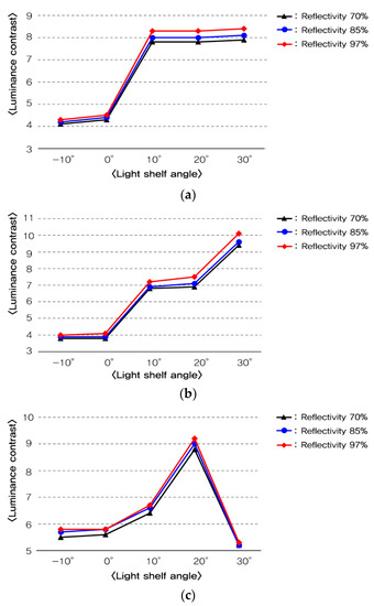 Analysis of luminance contrast per light shelf angle and reflectivity: (a) luminance contrast per light shelf angle and reflectivity in summer; (b) luminance contrast per light shelf angle and reflectivity in middle season; (c) luminance contrast per light shelf angle and reflectivity in winter.
