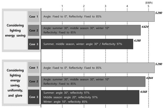 First, as shown in Table 8, the lighting energy consumption maintained an appropriate indoor illumination of 500 lx for an external type light shelf with an angle of 0° and a reflectivity of 85% (Case 1) 5.290 kWh. On the other hand, the appropriate angles of a movable external light shelf with 85% reflectivity (Case 2) for energy saving were 30°, 30°, and 10° for the summer, middle season, and winter, respectively, and the energy consumption was 4.624 kWh. Meanwhile, the angle and reflectivity, only for energy saving, of the light shelf with a rolling reflector that can change its reflectivity (Case 3) were the same as an angle of 30° and a reflectivity of 97% for the summer, middle season and winter, and the lighting energy consumption was 4.288 kWh.