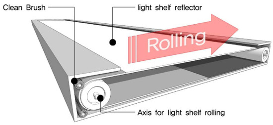 Third, an external type of light shelf has the advantage of excellent performance [27]. However, its lighting performance deteriorates because of the decreased reflectivity caused by soiling. Dust accumulates on the reflector because of exposure to the outside. Therefore, maintenance is important for an external type light shelf, but there are also difficulties compared to an indoor type light shelf. As shown in Figure 13, the light shelf with a rolling reflector that can change its reflectivity, provides a space in the upper and lower sides of the light shelf that allows for installing additional cleaning brushes to partially remove soiling. This helps the light shelf maintain a certain level of lighting performance for a longer period. That is, the proposed light shelf with a rolling reflector improves lighting performance, uniformity, and glare, and keeps the light shelf reflector clean. This feature also highlights the effectiveness of the proposed system.