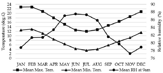 Most of the factors that adversely affect health, such as bacteria, viruses, fungi, mites, etc., have increases associated with high indoor relative humidity. Maintaining indoor relative humidity between 40% and 60% can minimise the indirect health effects [15]. New Zealand has a temperate climate with comfortable warm, dry summers and mild, wet winters. Housing thermal design not only focuses on winter indoor thermal comfort but also indoor health conditions related to high relative humidity. The abundance of two major causes of allergy and trigger asthma, mites and mould, in New Zealand housing increases proportionately with a rise in average indoor relative humidity. For a new house with sufficient insulation and double-glazed windows in Auckland, in order to keep the winter indoor mean relative humidity at 50% and within the range of 40–60%, the winter indoor mean air temperatures have to be heated up to and maintained at 21–22 °C by a central-heating system in a temperate climate with a mild and wet winter [16]. It is difficult and too expensive for houses only designed for temporary heating or without sufficient insulation to heat up the indoor air temperature of the whole house to 21–22 °C in order to maintain the indoor relative humidity below the thresholds of mould (60%) and mite (50%) survival and growth.