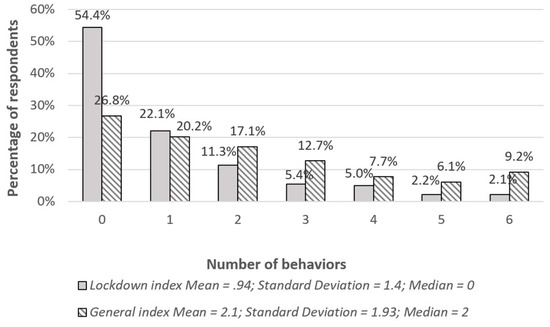 Two indices were created based on the items in Table 1. The first, termed a general index, concerned the whole period of respondents’ lives (including the lockdown period), while the second, termed a lockdown index, applied only to behaviors during the three-month-lockdown period. Detailed information about the indices is presented in Figure 1.