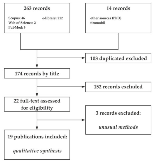 This study is a systematic review designed in accordance with the PRISMA Extension for Scoping Reviews (PRISMA-ScR) [16,17]. A systematic literature search was carried out in PubMed, Scopus and Web of Science databases as well as eLIBRARY [18]—the national Russian source of scientific literature. Search terms and combinations of terms in PubMed, Scopus, Web of Science and eLIBRARY included: «(iodine or iodine deficiency or iodine status) and (pregnancy or pregnant women) and (fertile women or women of reproductive age) and/or (newborn or infants) and (urine or median urinary iodine concentration) and (Russia)». Duplicate publications were checked and eliminated.