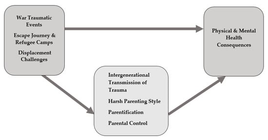 War traumatic events and displacement challenge directly-impacted children’s physical and mental health; however, additional interrelated factors in the family system were also impacted by the traumas and challenges families and children faced, which consequently contributed to the adverse impacts on children’s health. Children suffered from intergenerational transmission of trauma, harsh parenting style, parental control, and changes in the family dynamics and roles, illustrated in parentification. All these mediating factors indirectly influenced the health and mental health of children, as disclosed by the following.