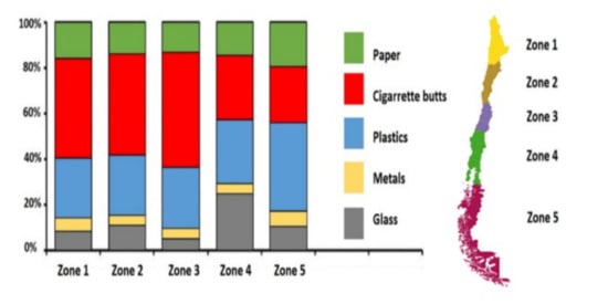 The main sources of beach litter are human activities. Unfortunately, in the last two decades, the amount of beach litter has increased considerably, such that contamination of beaches is currently recognized as a worldwide problem [,]. Therefore, effective action is crucial to make beaches safer and cleaner for users and to prevent environmental hazards. In the opinion of the authors, the first step to prevent and control beach contamination is to model and determine the level of contamination, which would lay the foundations for policies and administrative decision-making on this issue. Since 2007, an organization in Chile called cientificos de basura has been measuring beach litter on the main beaches in cities throughout the country. The group has found that the beaches in Antofagasta, northern Chile, are the most contaminated []. Moreover, according to the same study, plastics, cigarette butts and broken glass are the most common contaminants on Chilean beaches. Figure 1 shows the percentage of different beach litters in five different zones of Chile [].