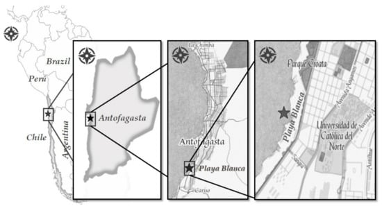 As noted above, Antofagasta has the most contaminated beaches in Chile [], which is why we decided to study and model beach litter on one of the beaches in the city. Antofagasta is located in northern Chile and is the capital city of the Antofagasta Region. The chosen beach, called Playa Blanca, is located in the southern part of the city (Figure 2).