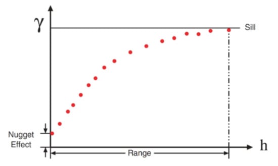 In addition to the number and position of sampling data, geostatistical algorithms consider the distance between data and target points and the spatial continuity to model the underlying variables []. The experimental variogram is the main tool to determine the spatial continuity of the variable under consideration, which is defined below: